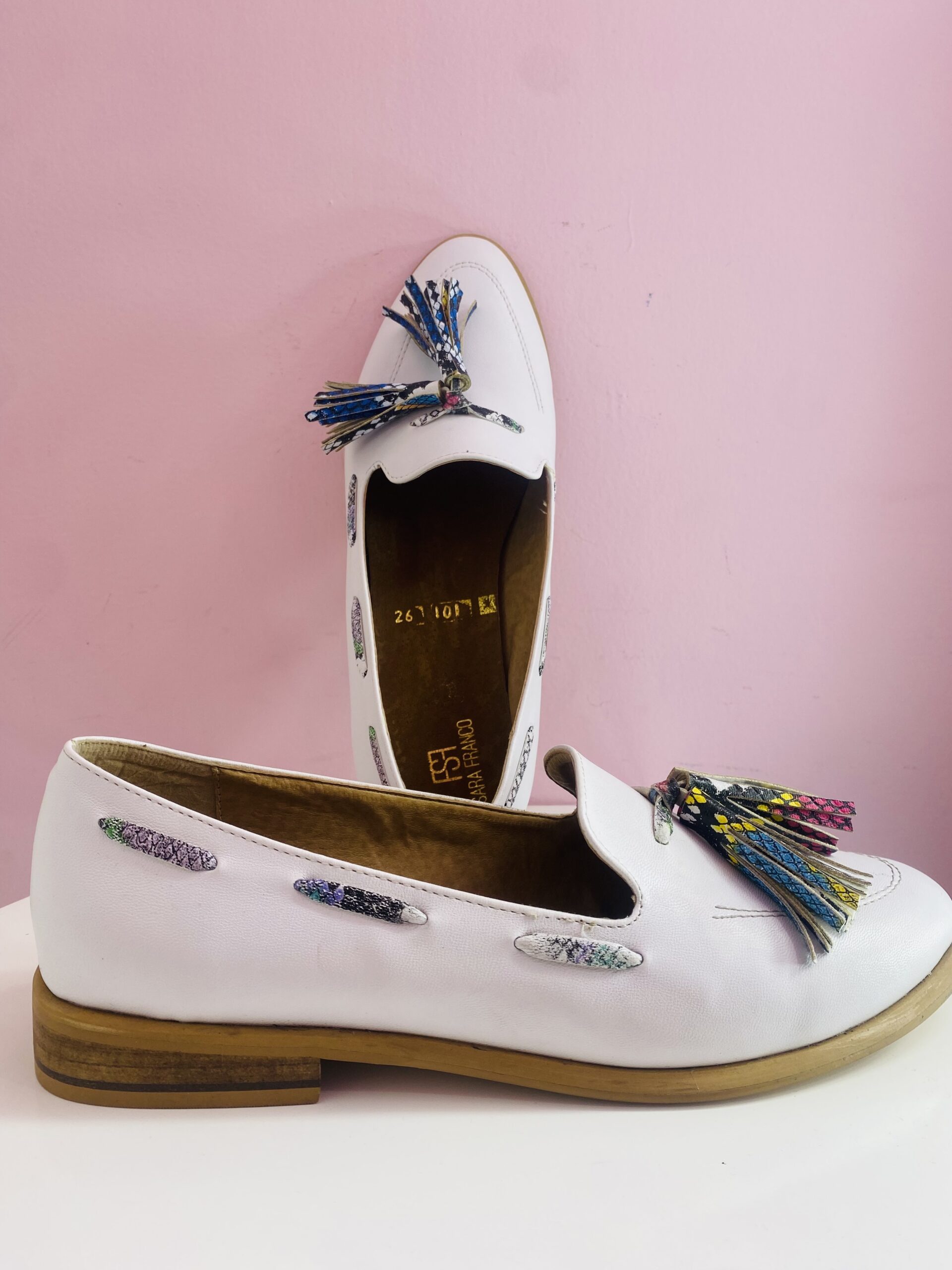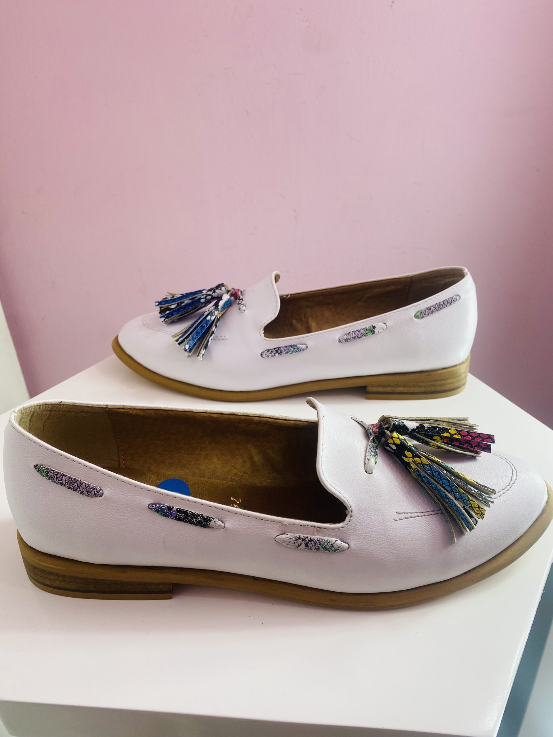 Mocasín blanco con borlas de colores